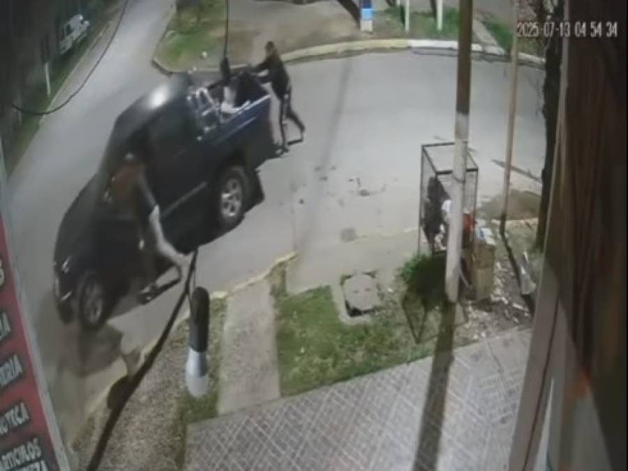 En las imágenes se observa cómo los delincuentes arrastraron la S10 varios metros hasta engancharla a un auto sobre la calle San Vicente, con el cual finalmente se dieron a la fuga con la chata.