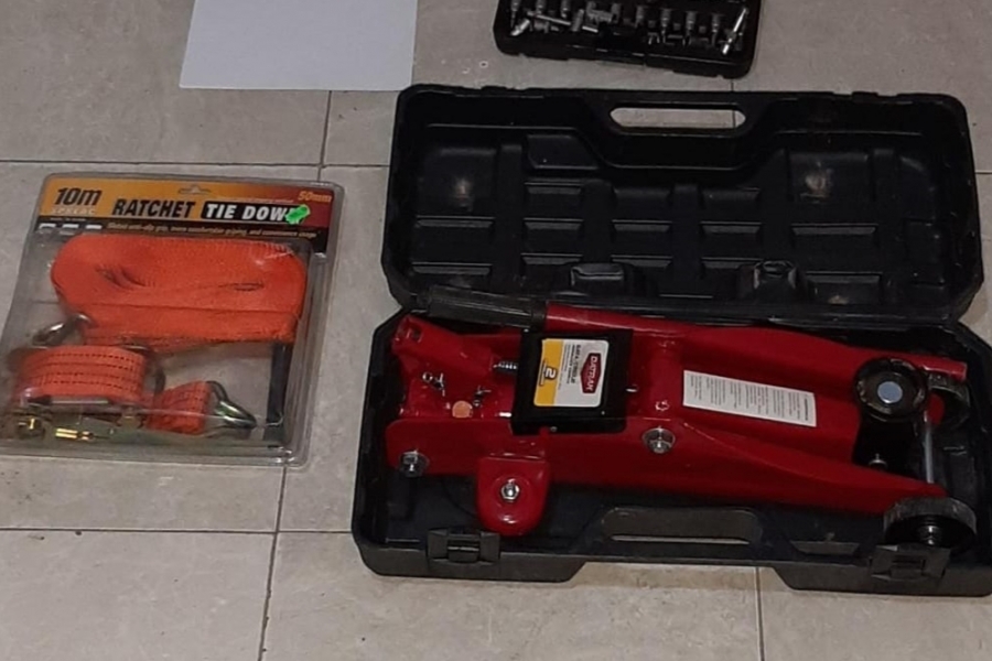 La policía decidió identificar al sospechoso, quien se presentó como Raúl Maximiliano Yusso. Al requisar los elementos que llevaba en sus manos se descubre que llevaba un gato hidráulico o cricket de color rojo, un juego de herramientas y una linga naranja dentro de su envoltorio, sin uso.