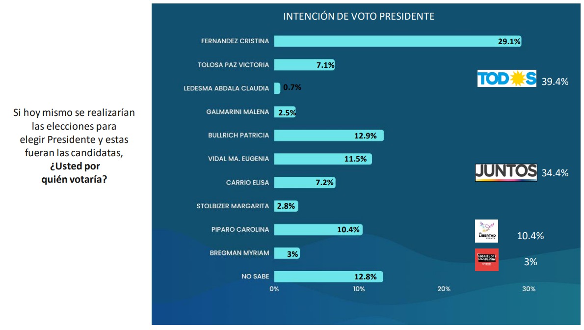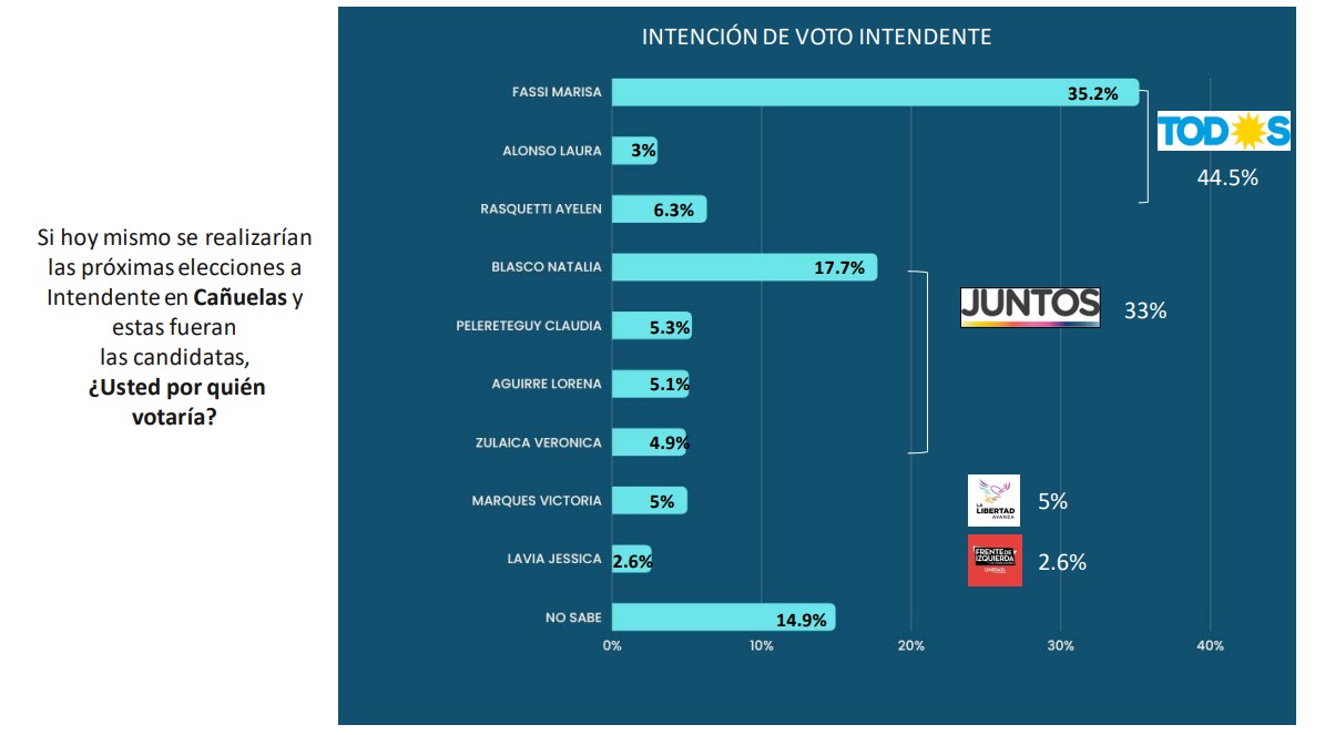 En esa hipotética interna oficialista la representante del massismo, la diputada provincial Ayelen Rasquetti, obtendría el 6.3% de los votos. Pero peor aún, son los números de Laura Alonso, referente de La Cámpora en el distrito y Secretaria de Inclusión del Ministerio de Desarrollo Social de Nación, quien acarrea con un nivel de desconocimiento del 50% y sumaría solo un 3% de votos en caso de ser precandidata.