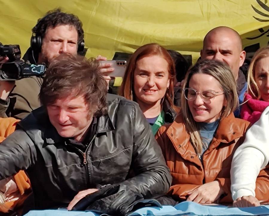 Ubicados en la parte trasera de una camioneta, los dirigentes se mostraron sonrientes mientras saludaban a las personas que se habían acercado hasta el lugar para vitorearlos y sacarse una foto Milei, el ganador de las primarias presidenciables.