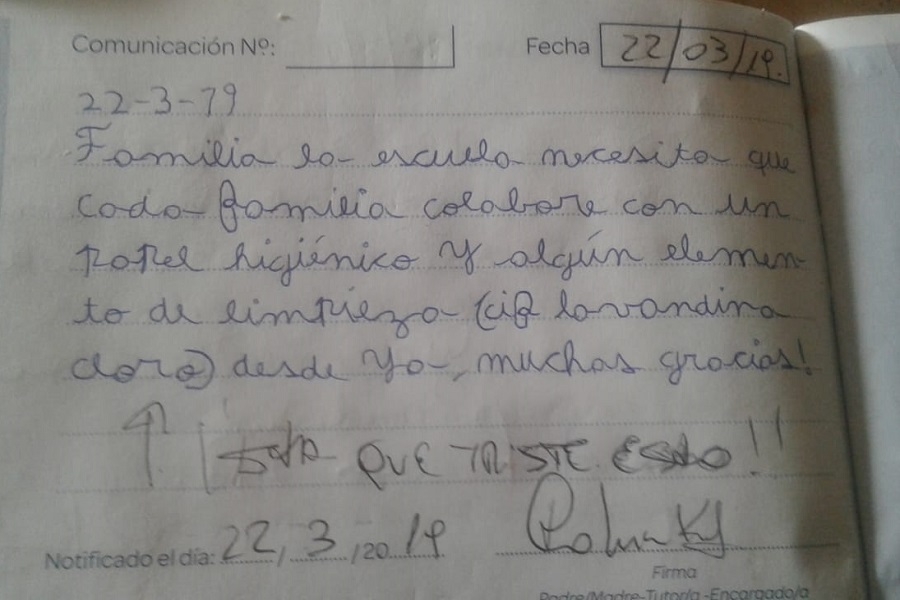 “Familia la escuela necesita que cada familia colabore con un papel higiénico y algún elemento de limpieza (CIF, lavandina, cloro). Desde ya, muchas gracias!”, es el mensaje escrito por un estudiante de 5º grado de la Escuela Primaria Nº11. De puño y letra. Y se repite en más establecimientos.